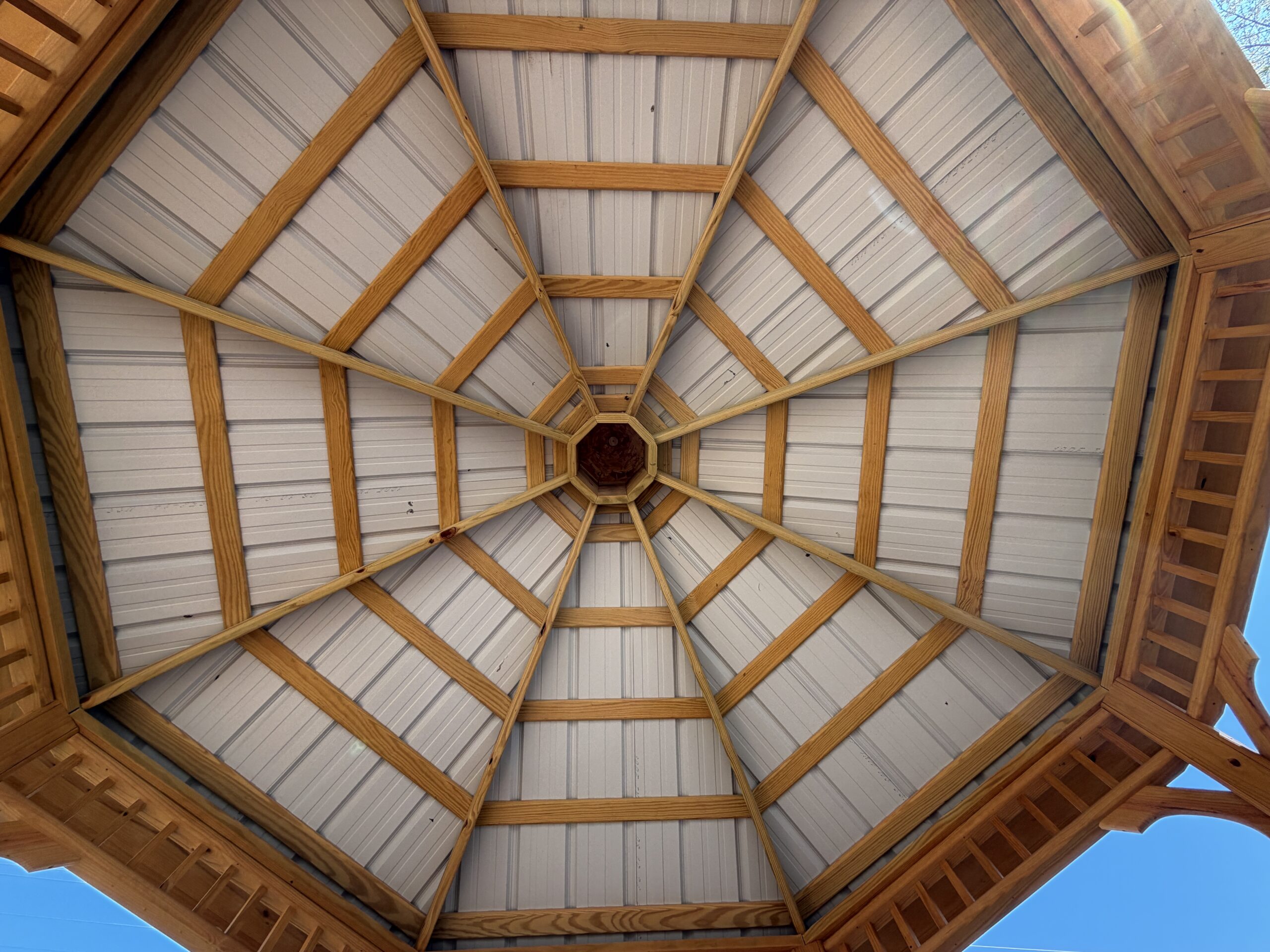 12×12 Octagonal Stained Gazebo, Portable custom Octagonal Gazebo, made of treated pine, includes railing.  Comes with metal roof and a classic cupola.  Lots of space for an outdoor dining set or swing!  If you love white, that’s great we can get in in white, but this stained treated wood does not show dirt and mildew as easily as white does!